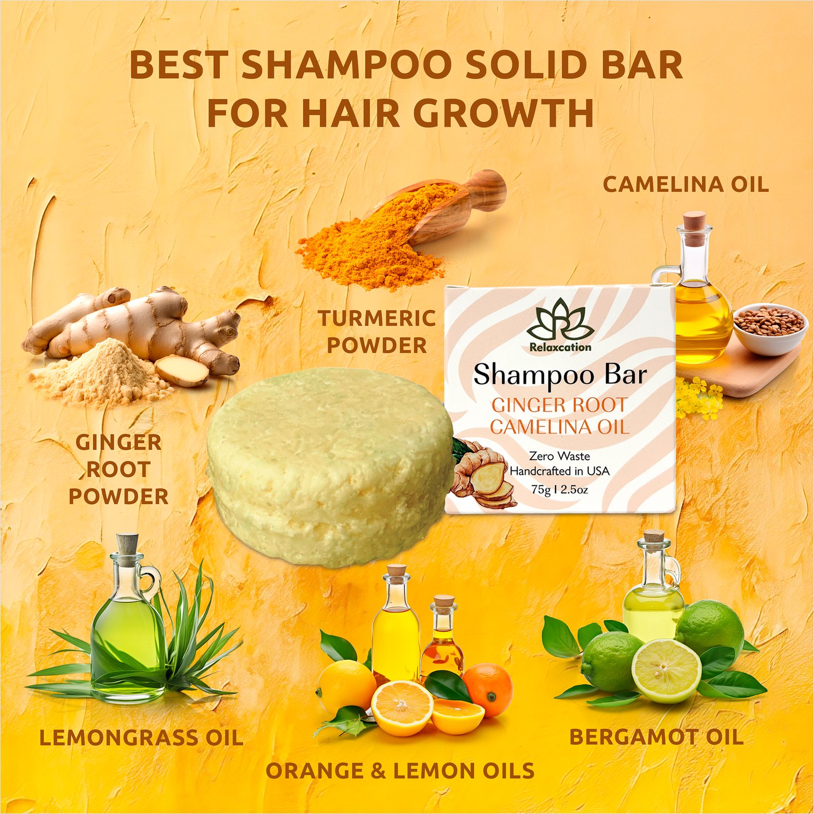 - GINGER ROOT HAIR GROWTH SHAMPOO: Infused with the natural potency of ginger, our organic shampoo bar stimulates the scalp, encouraging healthy hair regrowth for luscious locks.